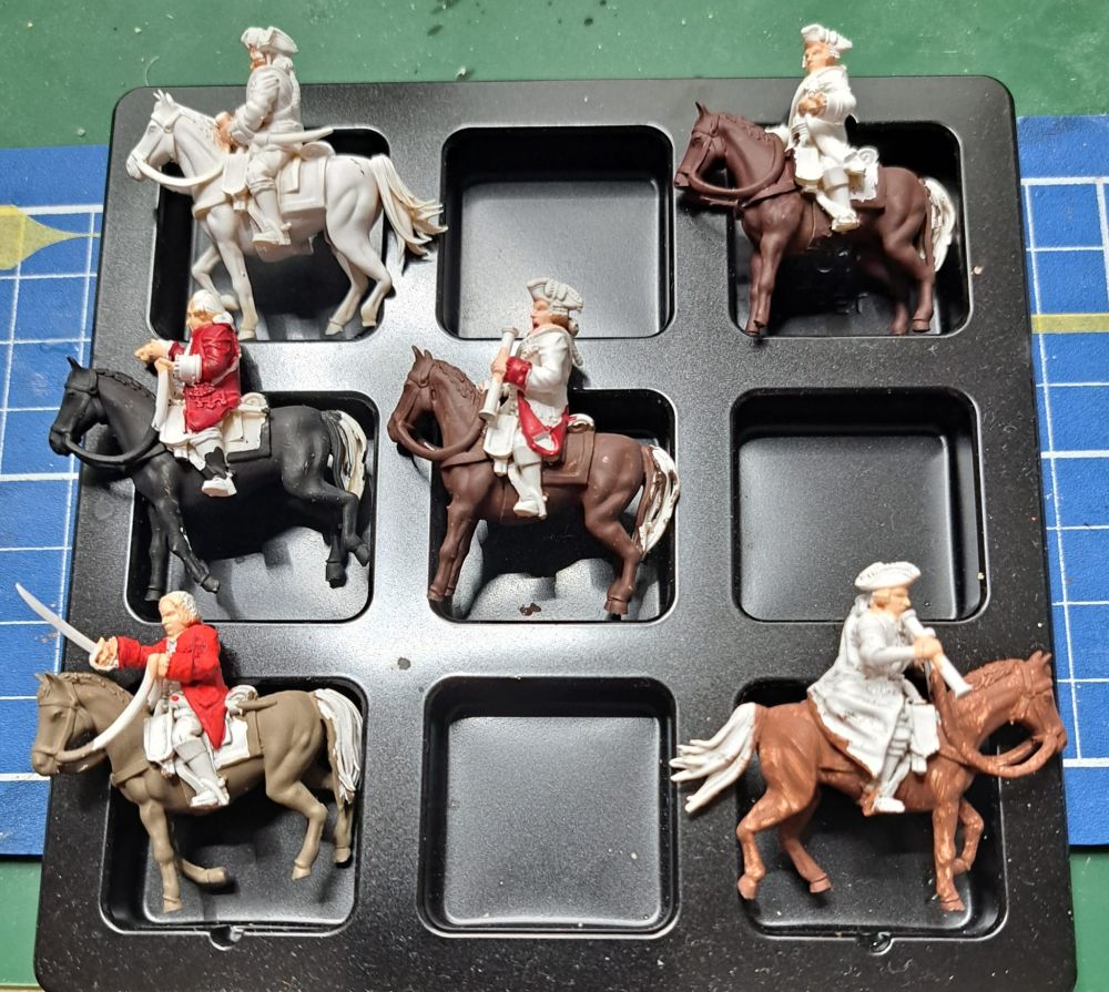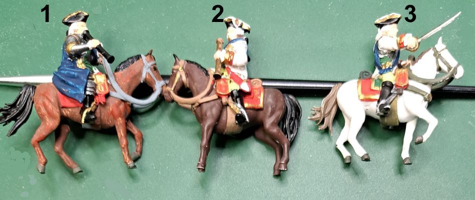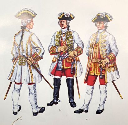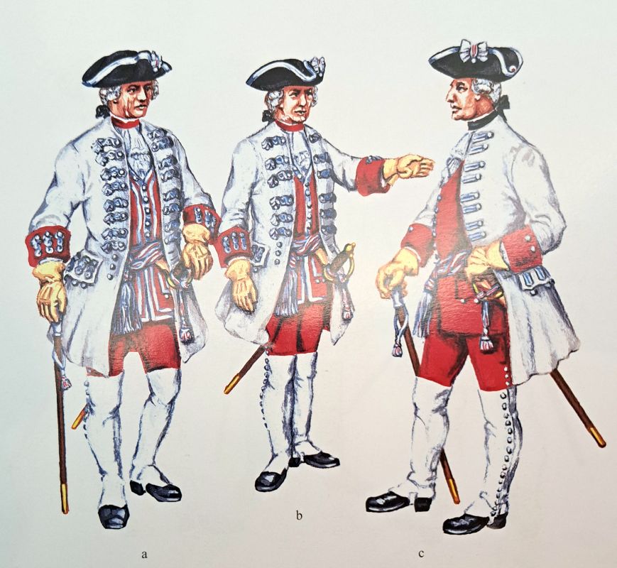 Die Farbgebung der sächsischen Uniformen jener Epoche sind in dem hervorragenden Büchlein "Die Uniformen der kurfürstlich sächsischen Armee 1683-1763 in farbigen Tafel ausführlich beschrieben. Der Verfasser Wolfgang Friedrich hat hervorragende Arbeit heleistet. Leider gab es das Buch nur noch antiquarisch für einen völlig überzogenen Preis, aber ohne es hätte ich nicht gewusst, wie die Angehörigen der Generalität und des Generalstabs in Sachsen im Jahre 1756 ausgesehen haben könnten.
