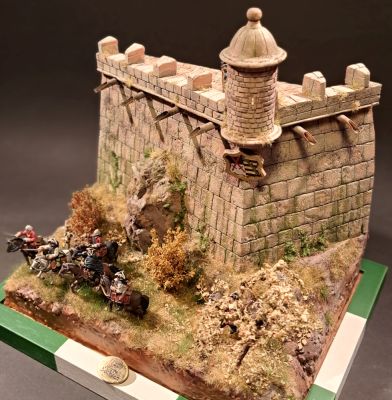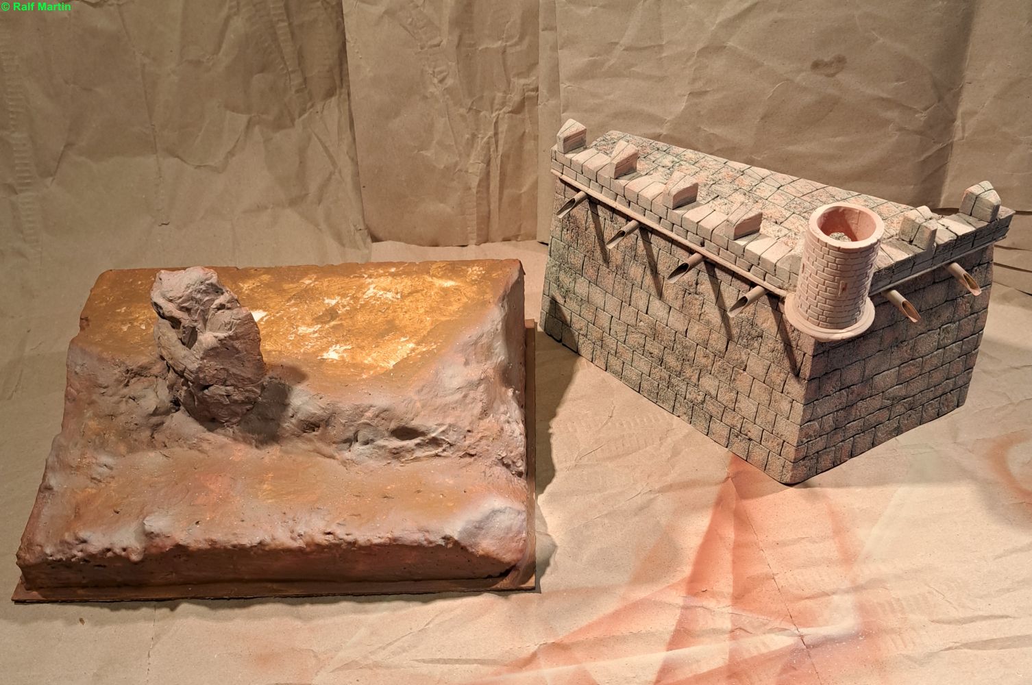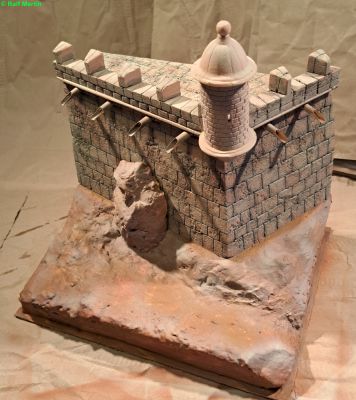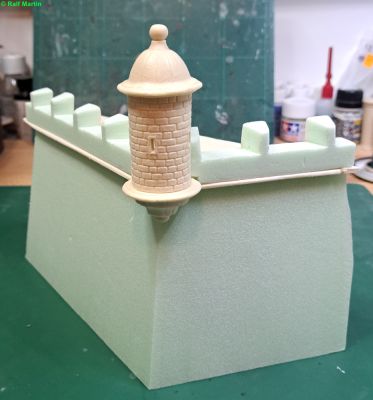 Wiederum aus Resten Hartschaum wurde die Grundform der geplanten Festunsecke modelliert. Das Material ließ sich mit Messer und anderen Klingen gut bearbeiten, nachdem es mit einem Wärmeschneider in die Grundform gebracht war.