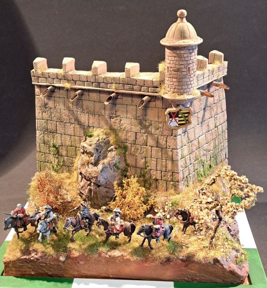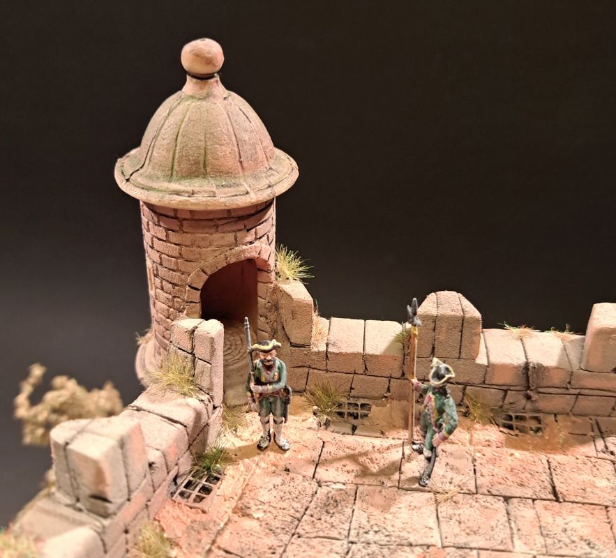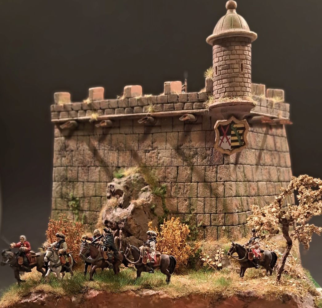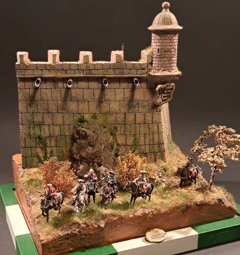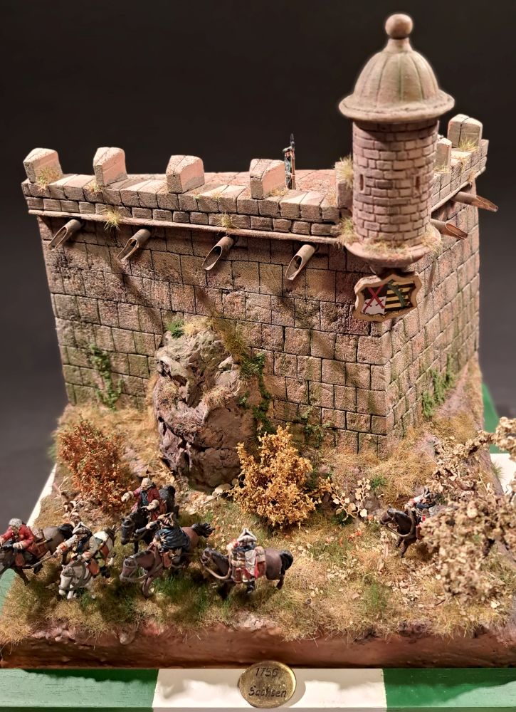 Die zwei Soldaten der Wachmannschaft auf der Festung sind aus dem Italeri Set mt französischer Infanterie aus dem 7-jährigen Krieg. Die grüne Uniform zeigt die Zugehörigkeit zur Artillerie, wie sie auf den sächsischen Festungen stationiert war.