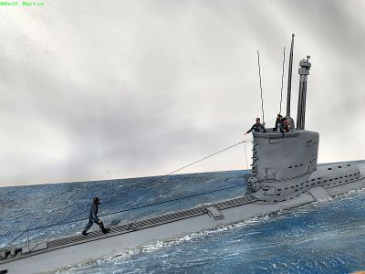 Mit ein paar Figuren von CMK hatte ich noch etwas Leben in das Boot gbracht und auf eine mit Acryl gestaltete Wasserfläche gesetzt sieht es ganz nett aus, auch wenn einige "Experten" bereits die Meinung vertraten, dass die hier wiedergegebene Wasserlinie und die sichtbare Kontur des Bootes nicht der Realität entsprechen würden. Wobei ich nicht weiß, woher die "Experten" so genau wissen, welche Realität gerade eigentlich dargestellt wird. Vielleicht war es für wenige Sekunden möglich, dass ein Typ 23 Boot genau so im Wasser gelegen hat...